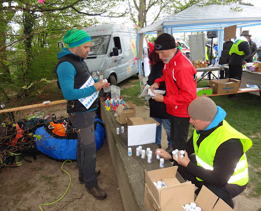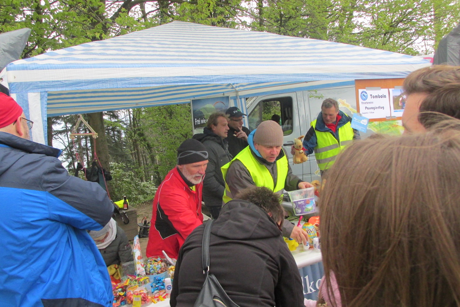 Nach dem Aufbau gings auch gleich in die Vollen und wir konnten von 11:00 bis 15:00 Uhr ganze 400 Lose zu je 2,- Euro verkaufen. Verlost wurden zwei Tandemflüge von Fly4You (Wolle & Marc – Danke!) sowie zahlreiche kleine und große Osterhasen und Osteraccessoires, die Dieter in aufopferungsvoller Kleinstarbeit und auf Basis sorgsam durchdachter Auswahlkriterien (sehr strukturiert!) in der Metro Hamburg erstanden hatte. Kaum auszudenken, welche Strapazen er auf sich nehmen musste: hunderte von Autobahnkilometern bis Baden-Baden allein unter Plüschhasen. Great! Zu jedem Los gabs kostenlos einen Seifenblasen-Thermik-Windanzeiger (STW) mit Geier-Aufkleber für die Kids, die gleich fleißig die Windrichtung testeten – was an diesem Tag aber auch ohne STW nicht allzu schwer viel. Impresario Martin mit Losfee Monika begeisterten das Publikum bei den Verlosungsdurchgängen.