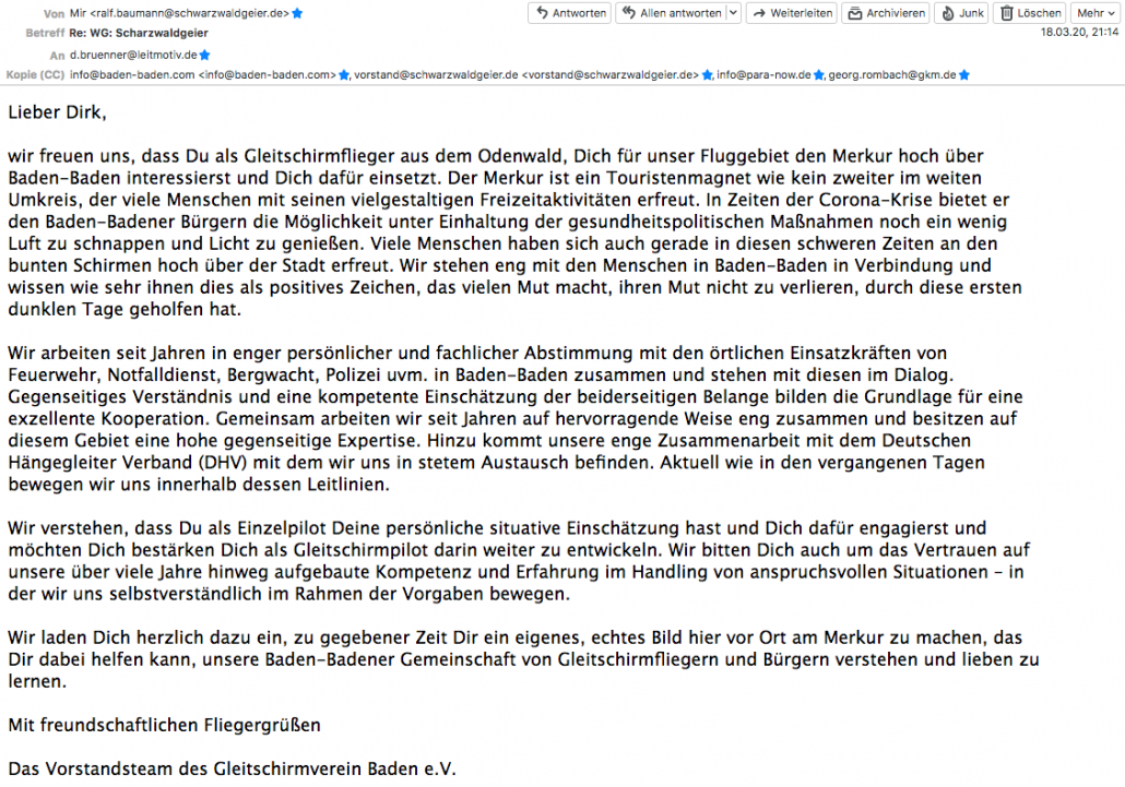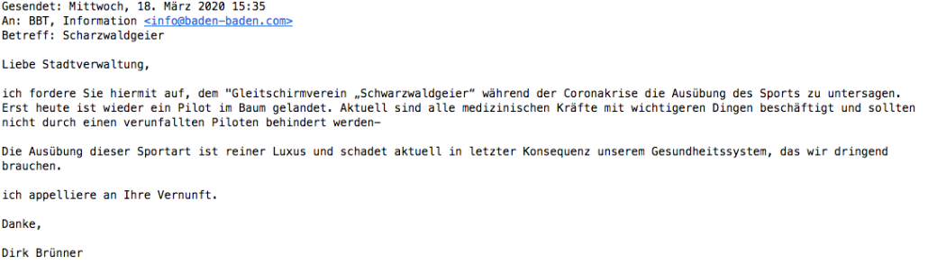 Neben allen sich über Tage hinziehenden Entscheidungen durften wir uns auch noch mit „Nettigkeiten“ der besonderen Art herumschlagen. Ein Gleitschirmpilot aus Mannheim hat sich an unsere Stadtverwaltung in Baden-Baden per E-Mail gewandt und diese dazu aufgerufen „dem Gleitschirmverein Baden e.V. … die Ausübung des Gleitschirmsports zu untersagen.“ Warum uns? Viele andere Fluggebiete hatten auch noch ihren Flugbetrieb aktiv? Der Pilot, Dirk Brünner (www.regioactive.de), ist selbst Mitglied im Gleitschirmclub Neckar Odenwald (www.para-now.de) und fliegt oft in Schriesheim, gibt jedoch selbst von sich zu, wenn man seine Kommentare von den eigenen DHV-XC-Flügen liest, dass er „einfach nicht der abgeklärte Starkthermikflieger“ ist. Muss man ja auch nicht sein, nur muss man gerade in kritischen Zeiten Ruhe bewahren und vor allem eines: besonnen agieren und reagieren – und wie beim Gleitschirmfliegen auch wissen, wann man seinem „Startimpuls“ folgt.