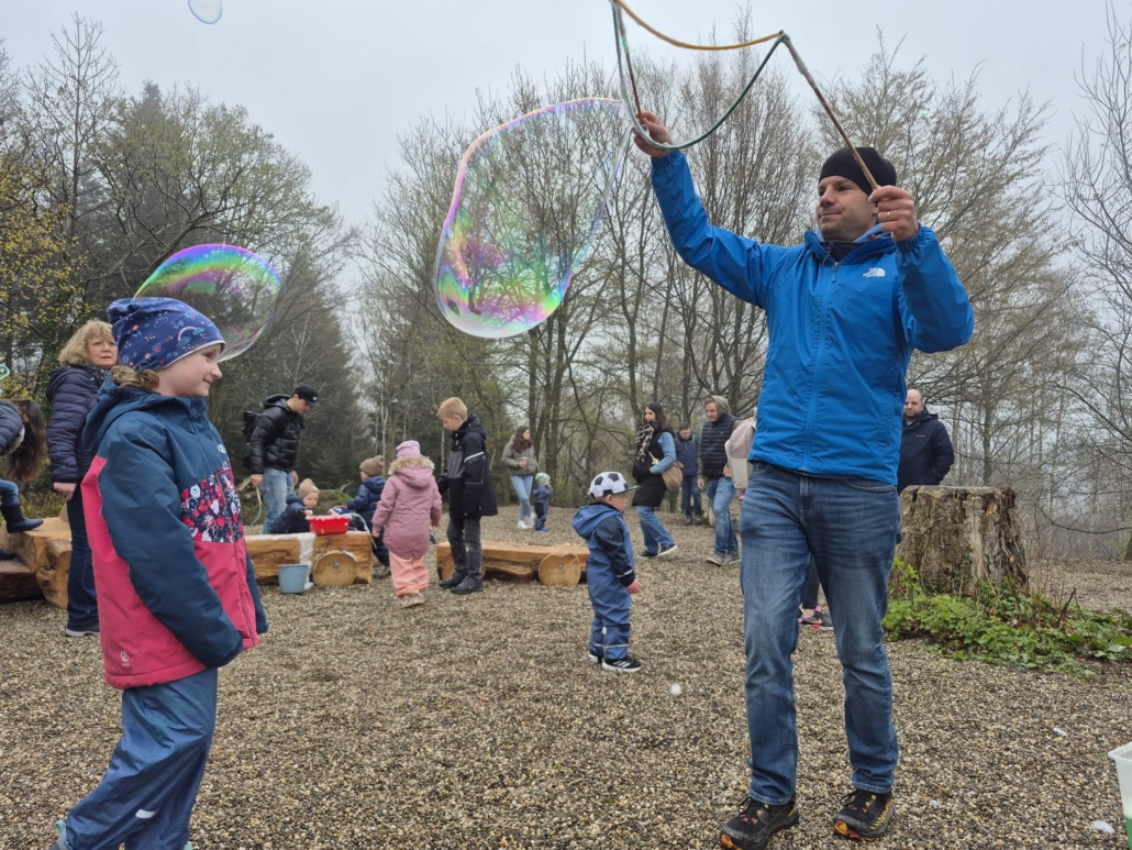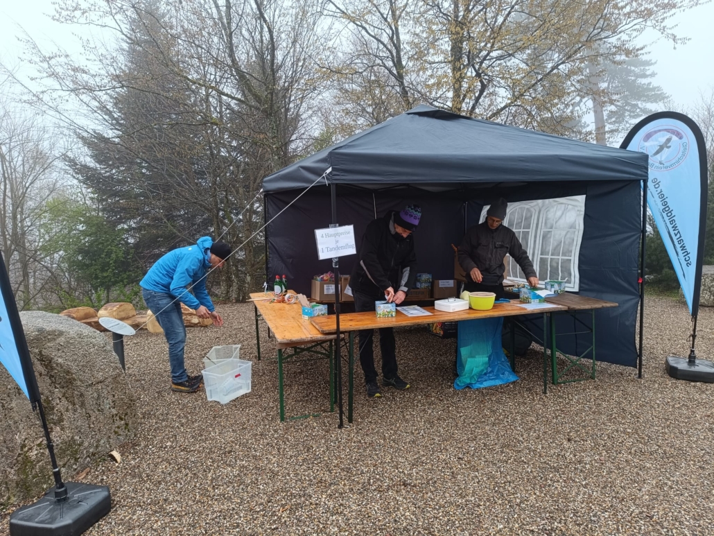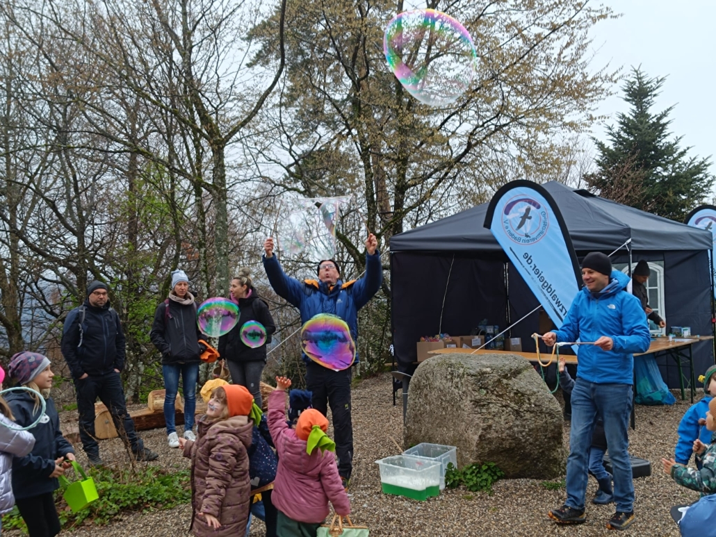 Der Tag begann um 8:00 Uhr mit dem Aufbau des Standes. Bänke, Tische, Pavillon und sämtliche Preise mussten mit der Bergbahn und dank Alois, der sein Auto als Transportmittel zur Verfügung stellte, nach oben gebracht werden. Um 10:00 Uhr startete die Veranstaltung offiziell. Trotz des durchwachsenen Wetters fanden schon bald zahlreiche Besucher den Weg zu unserem Stand und hatten großen Spaß an Losen und bunten Seifenblasen. Der Andrang hielt bis 14:00 Uhr an. Unser Team war durchgehend beschäftigt, die vielen Preise an glückliche Gewinner auszugeben. Unter den Hauptpreisen befanden sich auch vier Tandemflüge. Bereits im Vorjahr hatte unsere Seifenblasenaktion für Begeisterung bei Groß und Klein gesorgt – und auch diesmal verwandelten wir mit professionellen Seifenblasensets und reichlich Seifenlauge gemeinsam mit den Kindern den Merkur in ein Meer aus riesigen Seifenblasen.
