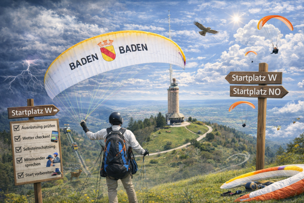 - Bereitet euch bitte im Eingangsbereich zum Startplatz vor. Niemand freut sich über einen einsam ausliegenden Schirm, während der Pilot noch gemütlich seine restliche Ausrüstung zusammensucht.