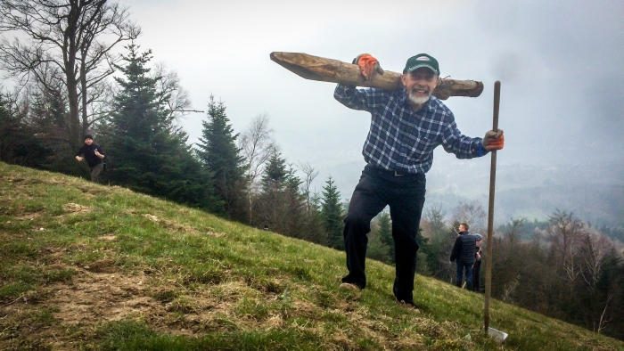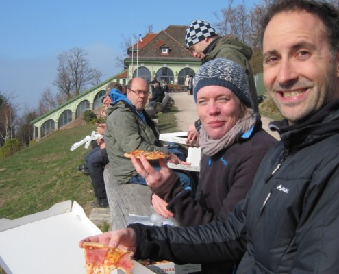 Auch wenn der frühe Blick in die Webcam nichts wirklich Gutes verhieß, so war der morgentliche Nebelmantel um den Merkur, der bis tief in die Baden-Badener Niederungen hinabwallte, nur das friedliche Vorzeichen eines Ausbruchs gestalterischer Energie, die ihresgleichen sucht. Von zehn Uhr morgens bis vier Uhr am Nachmittag unterzogen fünfzehn Landschaftsvisagisten unter der kompetenten Führung unseres Eventmanagers Claas Tzschucke unseren Flugberg einer tiefgehenden Verjüngungskur. “Q10” für die fliegerisch kultivierte Natur. Und das hatte der Startplatz West auch dringend nötig. Denn mehrere nächtliche Wildschweinfeten hatten dazu geführt, dass sich auf der Südhälfte eine unschöne Akne breit machte. Das haben wir jetzt in gleichermaßen schweißtreibender wie zen-haft hingebungsvoll fokussierter Kleinstarbeit wieder ins flächenhaft yin-yang’sche Gleichgewicht gebracht. Und damit die armen abwegigen Sauen in Zukunft nichts mehr versauen, haben unsere Bergfexe und -füchse gleich einen eindrucksvollen Elektrozaun um unsere Absprungfläche gezogen. Hier durften wir unsere Kräfte hinsichtlich des Erhalts eines möglichst harmonischen Landschaftsbildes mit gut ein Meter fünfzig langen und zehn bis fünfzehn Zentimeter dicken Akazienpfosten messen. Dafür, dass der Kontakt mit unserem Machwerk für die borstigen Vierbeiner zum nachhaltig prickelnden Erlebnis wird, sorgt die neue Solarstromanlage, die uns Ingo Winkler besorgt und installiert hat. Daneben wurde ein gefühlt bis zum Mittelpunkt der Erde reichendes Loch für einen zusätzlichen Windmasten auf der Südseite des Startplatz West ausgehoben, mit dem neuen Windmastbodenanker von Roland Klein ausgestattet und mit reichlich Beton und Steinen aufgefüllt. Am Startplatz West, Landeplatz West und Landeplatz Nordost erhielten die Windfahnen ein Update. Für die nötige Energie zwischendurch sorgten super Leckere hors d’oeuvre, Fruchtspieße und Kaffee von Margret Henn aus der Molkenkur-Küche. Abschließend gabs delikate Gipfel-Pizza. Besonderen Dank auch an Bernd Fahrner, den Bruder unseres zweiten Vorsitzenden Dieter Fahrner, der mit seinem nagelneuen Auto extra aus Freudenstadt an den Merkur gekommen ist, um den Unterboden seines durch zig Zementsäcke beschwerten Wagens mit dem staubig-steinigen Auffahrtsweg zum Merkurgipfel bekannt zu machen. Man kann nur allenfalls unzureichende Vermutungen anstellen, welch tiefe Schuld leichtsinnigens Zusagens hier im Bruder-Bruder-Verhältnis abzutragend aufzuwiegen war.