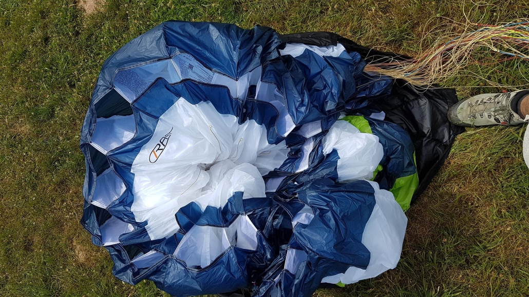 Foto 1: Rosette machen, in der Mitte Luft durch die Aussenteile drücken. Mit dem Fuss den Packsack fixieren und den Schirm in „den beutel“ schieben, fertig.