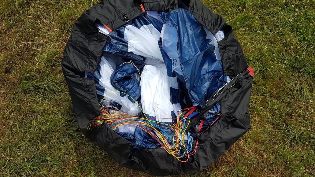 - In der Mitte ist dann die HINTERKANTE, die könnt Ihr zusammendrücken, so dass so viel Luft wie möglich durch die Eintrittskante und in den „Beutel“ schieben. Am besten fixiert man den Packsack mit einem Fuss, Siehe FOTOS. Beliebter Fehler: Restluft durch die Nähte pressen, das darf man auf keinen Fall. Den Fehler gibts bei der normalen Packmethode auch.